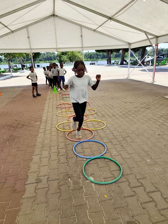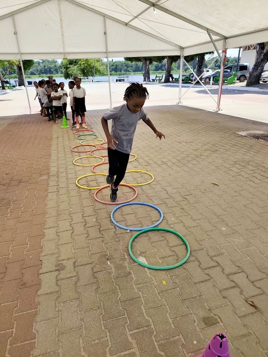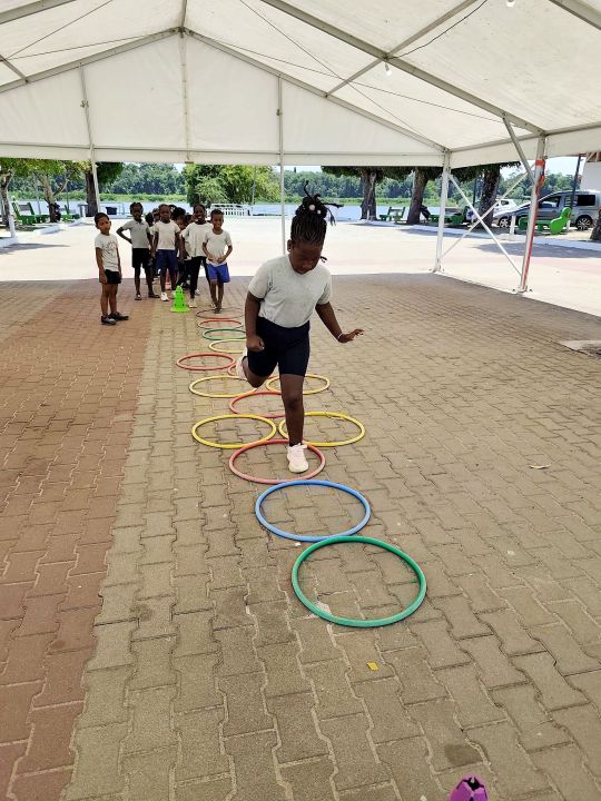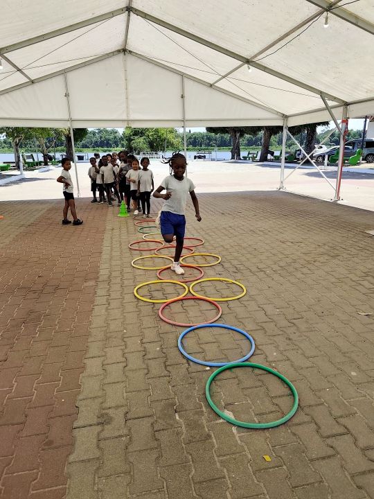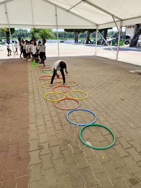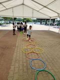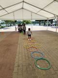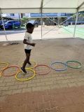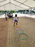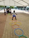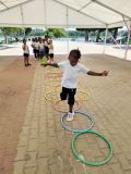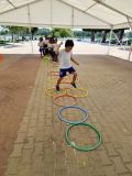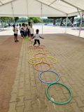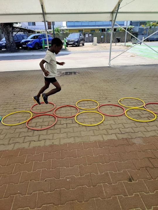 Ce mercredi là, Maîtresse Gé a fait une séance de coordination avec sauts dans les cerceaux sur la place Yves Patient. Pour certains élèves c'était assez compliqué. Heureusement, ils ont pu profiter de l'ombre des chapiteaux !